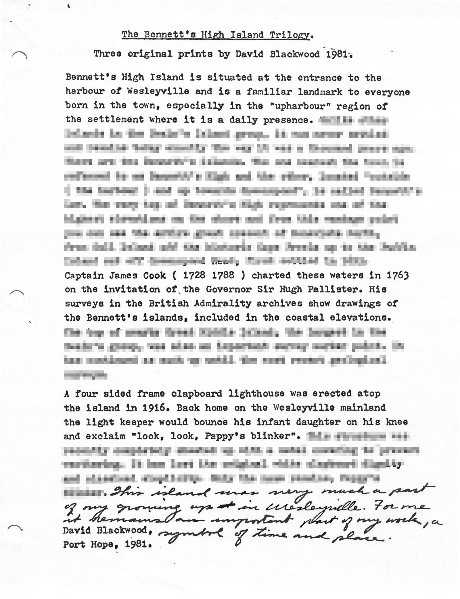 We have made every effort to ensure the accuracy of the information presented in this overview of David Blackwood's Bennett's High Island Trilogy. The details provided are supported by a variety of sources, including internal documented records, interviews, and articles from the Edmonton Journal supplied by Newspapers.com. However, we acknowledge that despite our best efforts, there may be some errors or omissions.